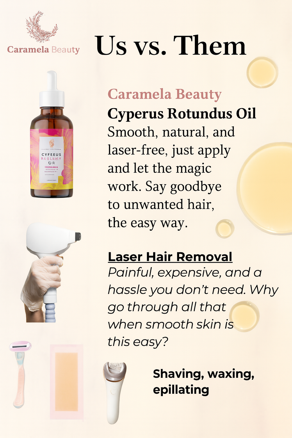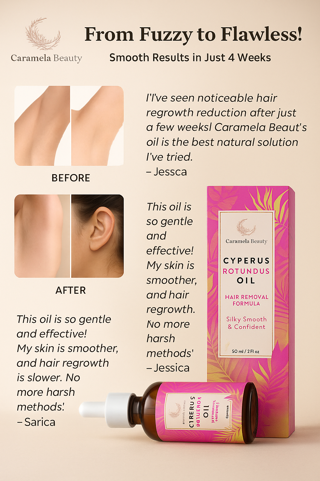 Novari’s Cyperus Rotundus Oil is your all-in-one natural hair removal solution. This gentle formula helps slow regrowth, softens hair at the root, and soothes skin—so you can stay smooth and confident, without the harsh side effects of traditional methods.